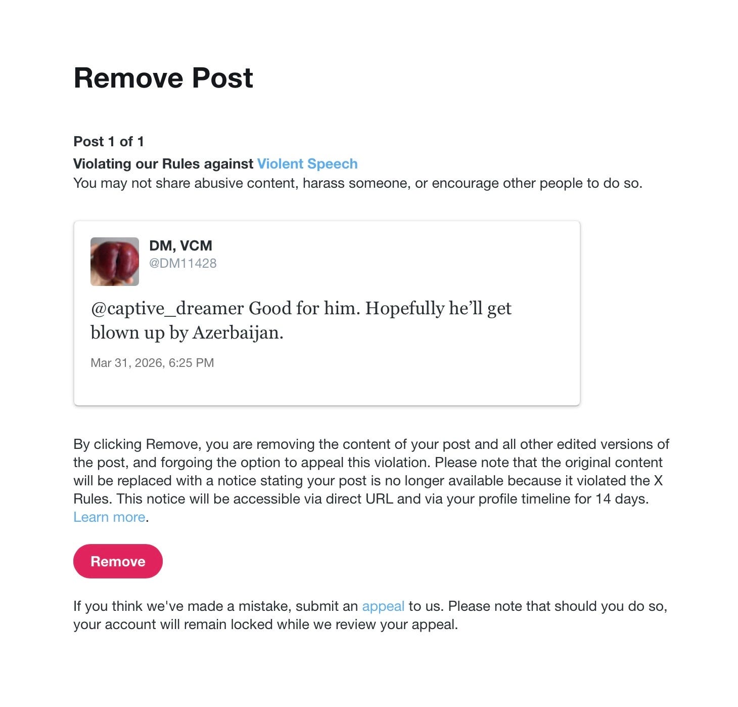 There’s zero point in arguing with X about this. One should reserve energy for the fights that count. I was simply curious about which post violated the rules. I removed the post, but not before screenshotting it and posting it here for the record.
