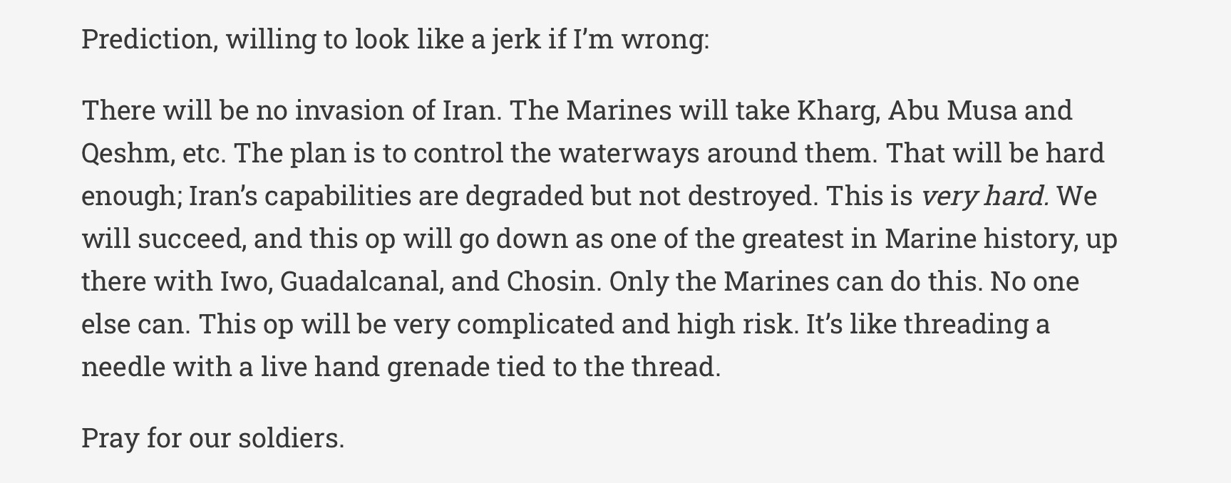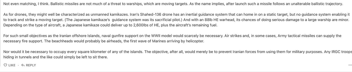 It’s perfectly fine to say that the human cost of Iwo (26K casualties; 7K dead) puts it in a different category — that’s legit. That’s the value system speaking. I acknowledge that. I even share it on one level! But that wasn’t what I referring to. I was referring to the operational difficulty of taking Kharg and the other islands in the Gulf.