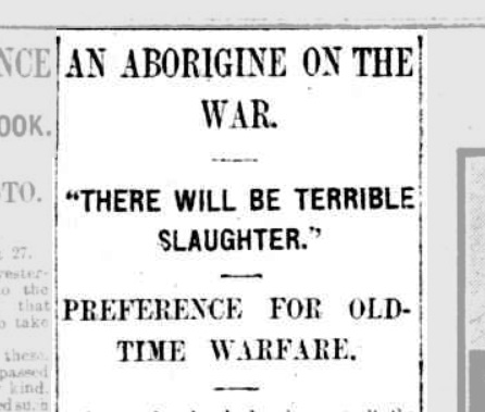 It appeared in The Advertiser, Friday 28 August 19144 24 days after the King declared war on Germany. Matthew Kropenyeri, described as “an aborigine from Point McLeay Mission Station.. a self-educated man of more than ordinary mental capacity, although, a full blooded native”5 analyzed the situation clearly: