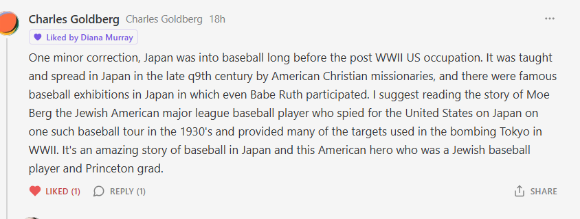 Thank you to the commenter who pointed out my historical blooper about the origins of baseball in Japan: