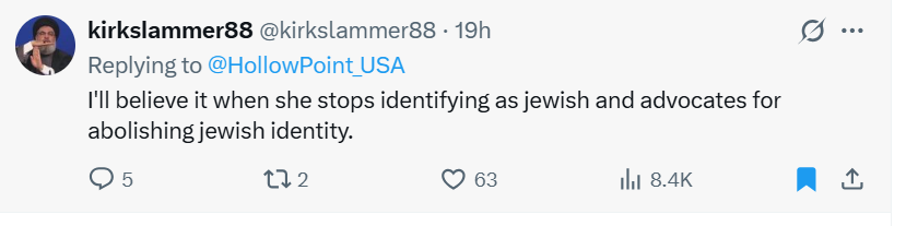 Of course, the “kirkslammer88”’s won’t stop at “Jewish identity” - they want to exterminate us physically - but a significant part of the left will actively advocate the abolition of Jewish identity, period.