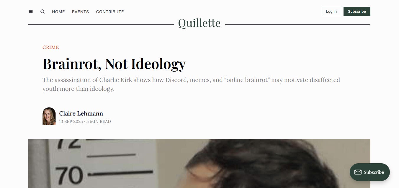 I think this is centrist bullshit. Pointing fingers at Discord or gaming sites for his radicalization is a distortion and a distraction. You can have brainrot AND ideology—indeed, they go hand in hand. The question is: whose ideology?